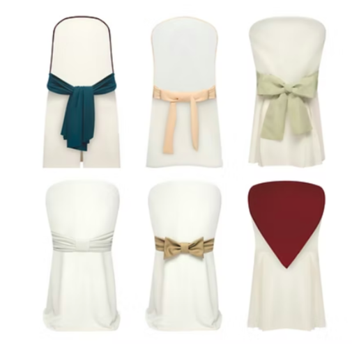La funda cubre completamente la estructura de la silla, ofreciendo una apariencia uniforme y cuidada, mientras que el lazo decorativo añade textura y contraste visual, convirtiendo cada asiento en parte de la decoración del espacio.